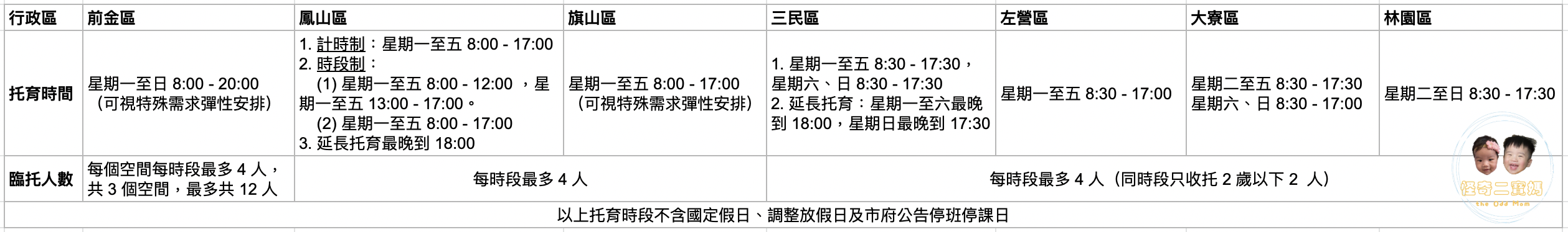 - 一般定點臨托:高雄市各行政區規劃不同,請參閱前述表格