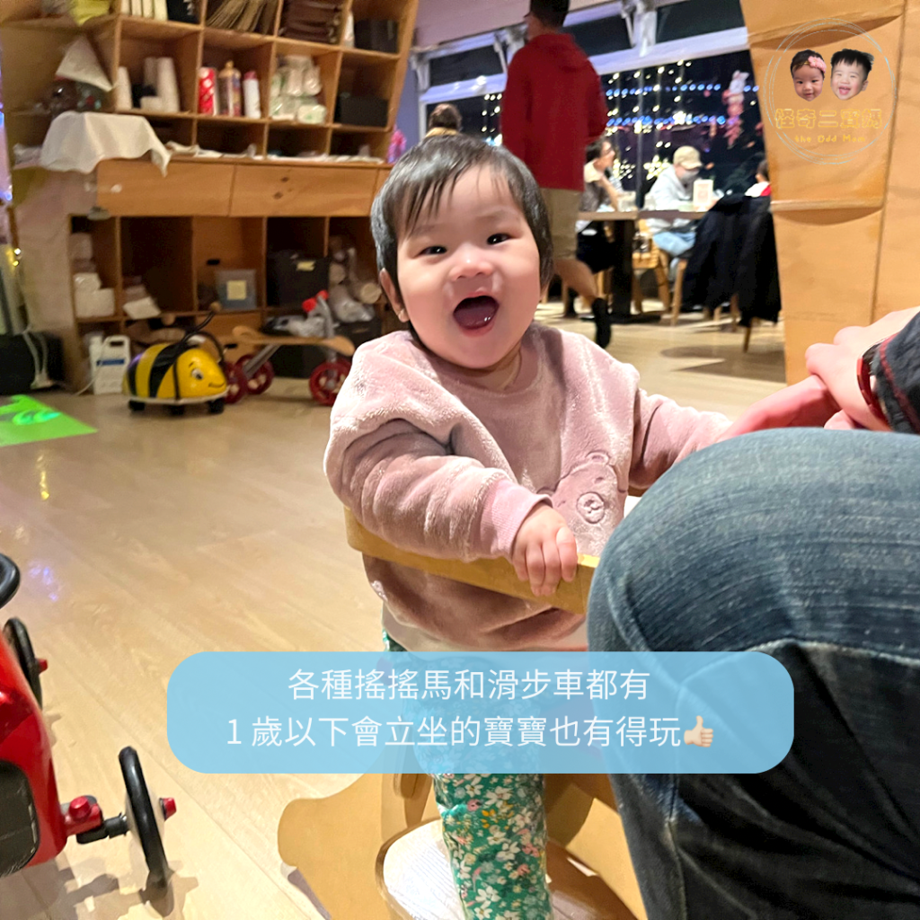 1- 遊樂設施很夠,人數控管周到,很難有小朋友玩不到東西的狀況,而且就連未滿一歲的小朋友也可以坐搖搖馬,完全不無聊